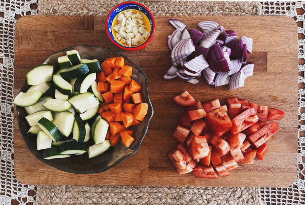 Do the same with tomatoes we need thicker chunks. Onion blogger slices. Courgette slices it in two lengthwise and then chop it into half circles. You want the curry to still be crunchy so we need bigger pieces. Garlic on the other hand can be cut into smaller pieces, we want it to melt away a bit.
