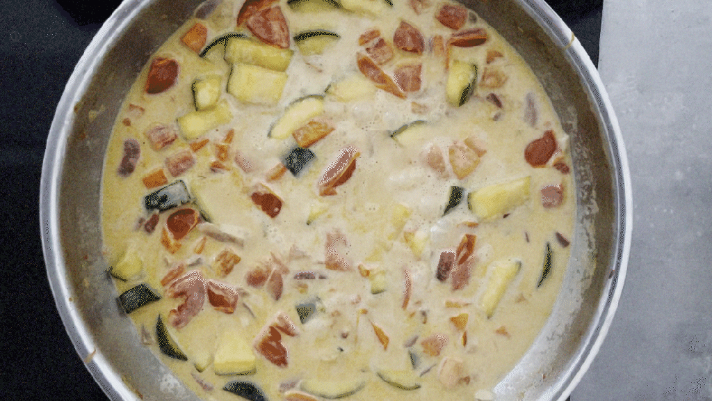 Set the pan to medium heat (we used 6th out of 9 levels on our induction stove). Add olive oil to the pan, wait a moment so the olive warms up. First add the onions and sauté for 2-3 minutes. After that add carrots and again sauté for 3-4 min. Repeat with courgette, steer it for another 3-4 min. Add a pinch of salt- it will soften veggies faster. Add garlic and steer it for another 2 min. Add your soy sauce and vinegar. Add tomatoes to the pan and fry and steer for 3 min. Add a spoon of curry paste and mix it all together so it covers all the veggies evenly and fry it for another min.
