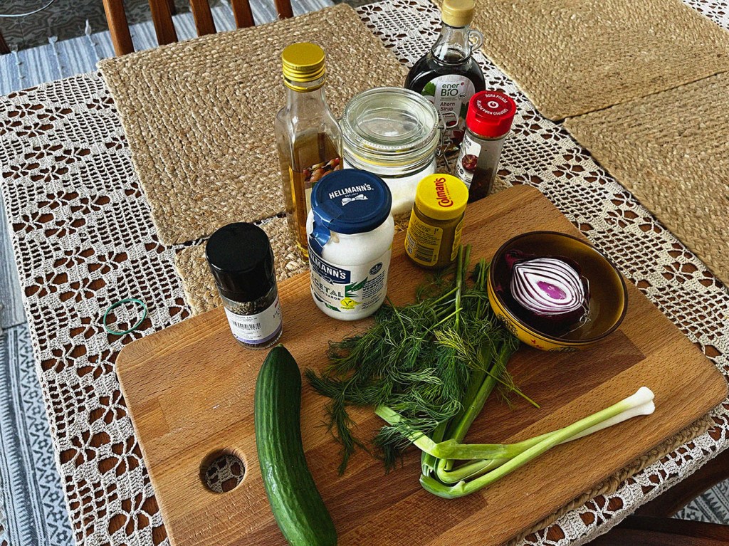 Chop all your veggies into small pieces. Onion, cucumber, dill and spring onions. Get the dressing rolling. Add 3 tsp vegan mayo, ½ tsp mustard, 3 tbsp apple vinegar, 2 tsp of clone syrup, 2 pinches of pepper, 1 pinch of chili flakes to a bowl and mix till you get a smooth texture. After you feel the mixture is done, mix it with all the veggies.