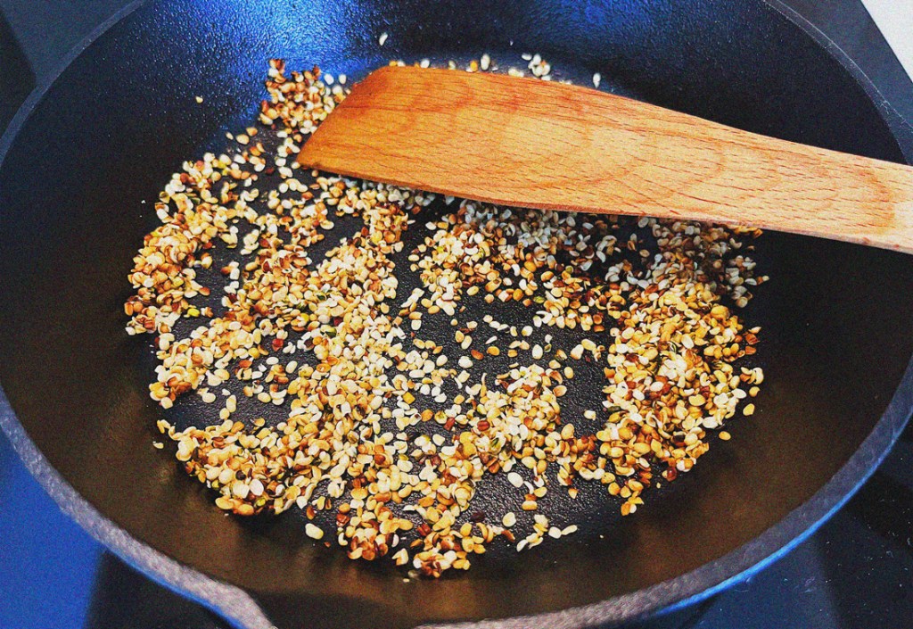 Set the pan to medium heat and toss your seed. I mentioned I used canopy seeds but I used seeds to add some crunch. If you have sunflower seeds or pumpkin seeds this will totally work.