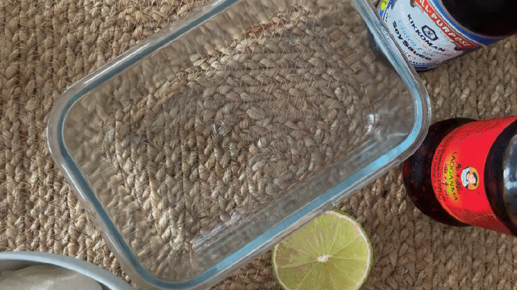Add a bowl/dish half of lemon/lime juice with soy sauce (i use vegan low salt version) with chili oil. Mix it all and add water.Shred tofu into small cubes – i aimed for 2 cm sizes, but i wasn’t very vigilant. You can press it before adding it to the marinade. I never have time for this, and it works without it too. I leave it in the fridge for 20-30 min.