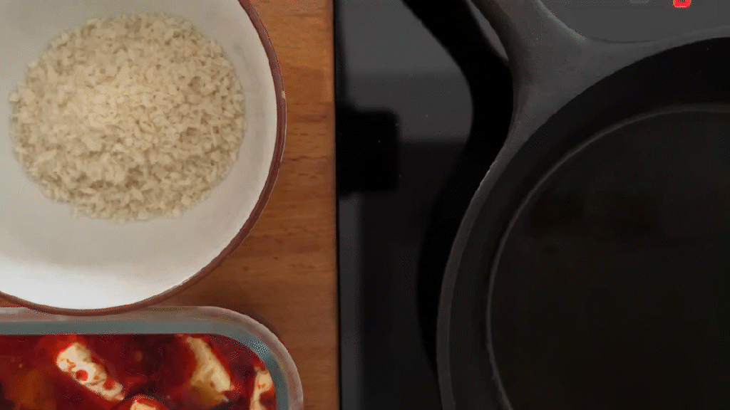 Add oil to the pan, be generous, the whole surface needs to be coated in oil. Add breaded tofu and fry for about 3 min on medium heat on each side.