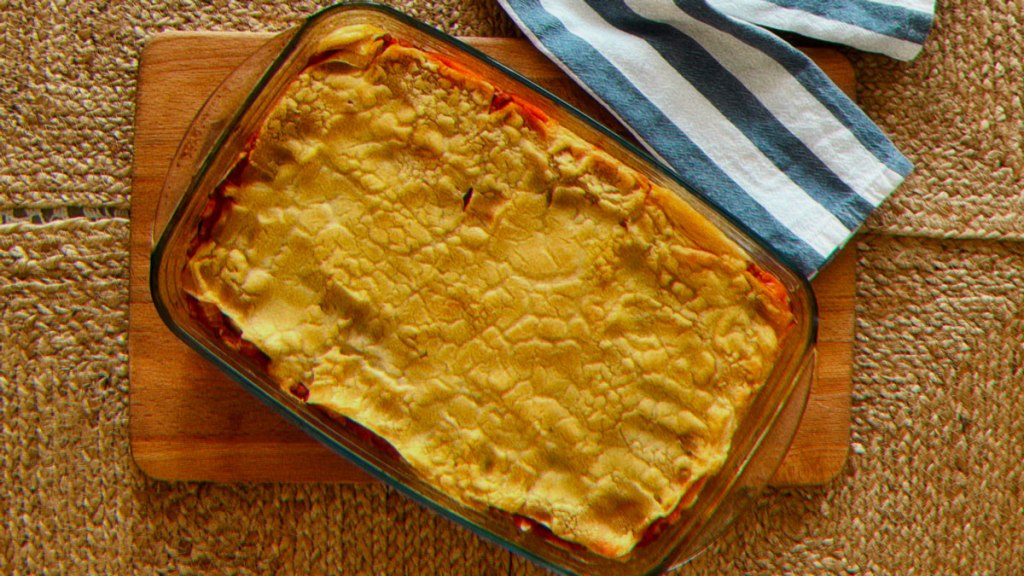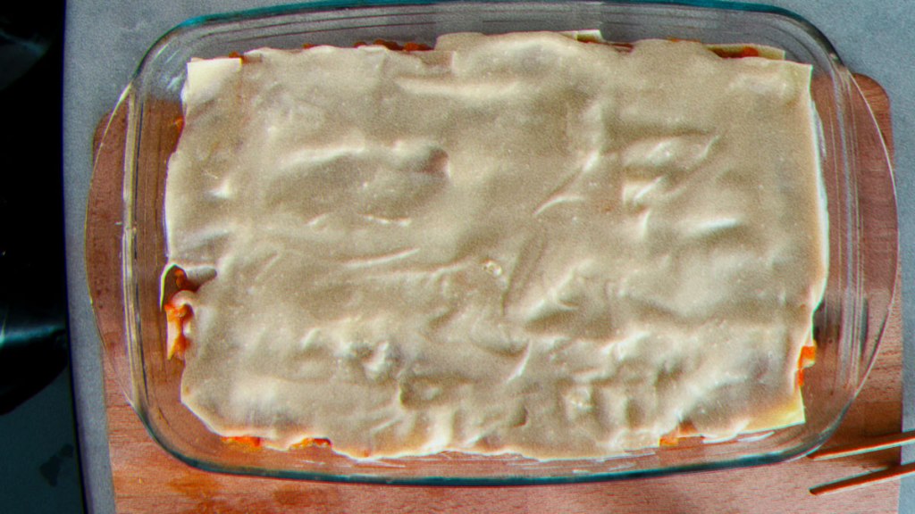 Grab a baking dish, and start layering your lasagna sheets at the bottom. Top it with the tomato and lentil mixture. Add another sheet layer then add your bechamel.
