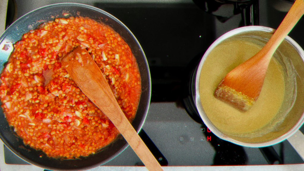 Start by frying diced onion over medium heat in a pan. Then, add chopped garlic. Season everything with salt and pepper. Once translucent, add passata and lentils – cook until they’ve reduced in size.
