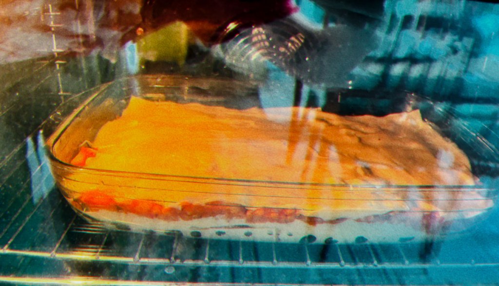 After adding another layer of lasagna sheets and add lentil and tomato sauce on top. After again repeat the layer of lasagna sheets and pour the rest of the bechamel. Add to the oven for 45-50 min at 180C. The top should go golden.