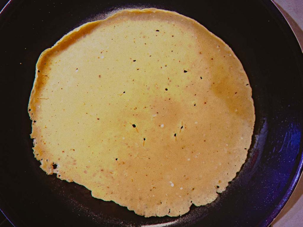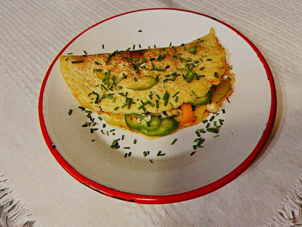 I spread mayo on the surface of the omelet and added chickpeas and the rest of the veggies. All placed on half of the omelet and later on covered it with the other half of the pancake.