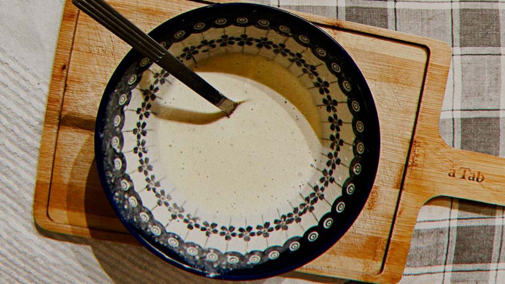 Mix flour, aquafaba and water till smooth with a fork. Ensure the consistency is liquid and not too thick. If needed, you can add more water or aquafaba. Add spices to the mix. Salt and pepper for taste and turmeric for lovely color. By adding aquafaba you make sure that omelets will set together better. I tried several different options. I think this works the best. It is the easiest way to make it.